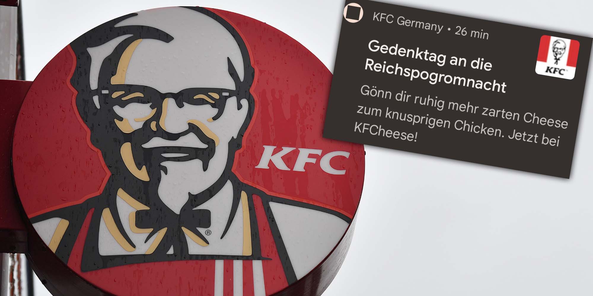 Der Fast-Food-Riese Kentucky Fried Chicken verschickte am Mittwoch eine geschmacklose Handy-Push-Nachricht. Unter dem Titel “Gedenktag an die Reichspogromnacht” sollten sich die Kunden “ruhig mehr zarten Cheese gönnen”.