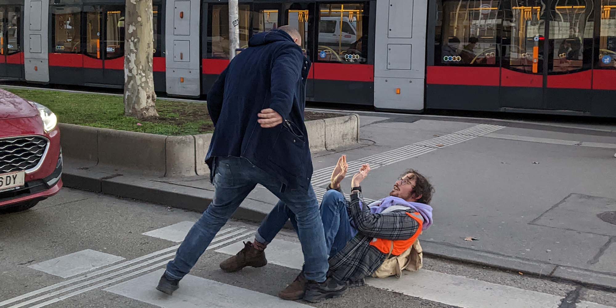 Jacob war auch einer der Aktivisten, die bei der Gürtel-Aktion Opfer von Angriffen eines rabiaten Autofahrers wurden. Ein Twitter-Video der “Letzten Generation” zeigt, wie der Mann die am Boden sitzenden Personen beschimpft und sogar handgreiflich wird. “Geh weg, Oida!”, schreit er einen Aktivisten an, während er ihn an der Warnweste brutal wegzerrt. Am Ende des Videos geht er auf Jacob los, tritt auf ihn ein, dann endet das Video.