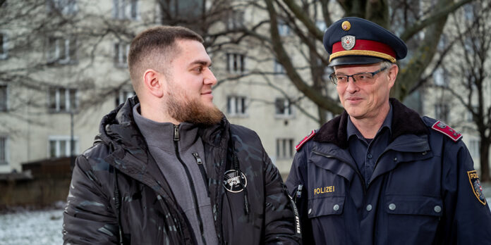 Wien | Es geht zur Lagebesprechung mit der Polizei. Allerdings nicht ins Revier, sondern ins Café Monika im 20. Bezirk. Unter dem Codewort „Uwe“ wird man zu einem Tisch hinten im Eck geleitet. Da fallen sich gerade zwei auffällig ungleiche Personen in die Arme: „Uwe! Serwas!“ Dann setzen sie sich einträchtig nebeneinander und lächeln sich freundschaftlich an: Ahmad und Uwe.