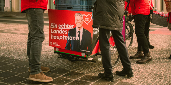Irgendwann reißt der Strom der Leute mit SPÖ-Blumentöpfchen ab, eine Gruppe an roten Wahlhelfern mit einem Bollerwagen trottet langsam die Bahnhofsstraße entlang, vorbei an der mächtigen Landesregierung. 300 Töpfchen habe man verteilt, erzählen sie. Unter den Schenkern ist auch der Klagenfurter Vizebürgermeister, Phillip Liesnig. Im Stadtrat führt er eine eher komplizierte Ehe mit dem Team Kärnten. Es sei gar keine Koalition, sondern lediglich ein „Arbeitsübereinkommen“. Warum die SPÖ in Klagenfurt nicht selbst auf dem ersten Bürgermeistersessel sitzt, ist eine lange Geschichte und würde hier den Rahmen sprengen. Daher lieber zurück zur anstehenden Landtagswahl.