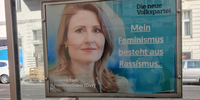 Wien | „Mein Feminismus besteht aus Rassismus“: Neben diesem Slogan prangt die Frauen-, Integrations- und Medienministerin Susanne Raab (ÖVP) am heutigen Weltfrauentag auf zahlreichen Plakaten bei Bus- und Straßenbahnstationen in der Wiener Innenstadt. In den sozialen Netzwerken war schnell Wirbel um das Plakat der ÖVP-Politikerin.