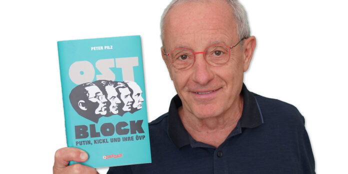 Am Cover von „Ostblock“ posieren Kickl, Nehammer, Kurz und Putin in Ostblock-Manier. Peter Pilz erklärt das Bild in seiner Einleitung: