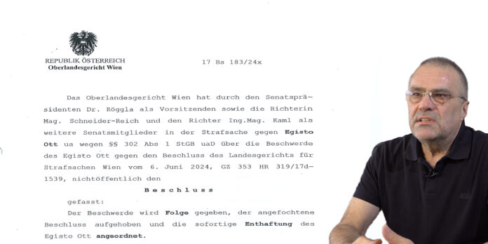 Am Mittwoch, den 26. Juni 2024, wurde der Untersuchungshäftling Egisto Ott kurz nach 10.30 überrascht. Ein Justizwachebeamter öffnete die Zellentür und teilte Ott mit, dass er gehen könne. Grund dafür war ein Beschluss, den ein Senat des Oberlandesgerichts Wien unter dem Vorsitz von Dr. Werner Röggla am selben Tag ausgefertigt hatte.