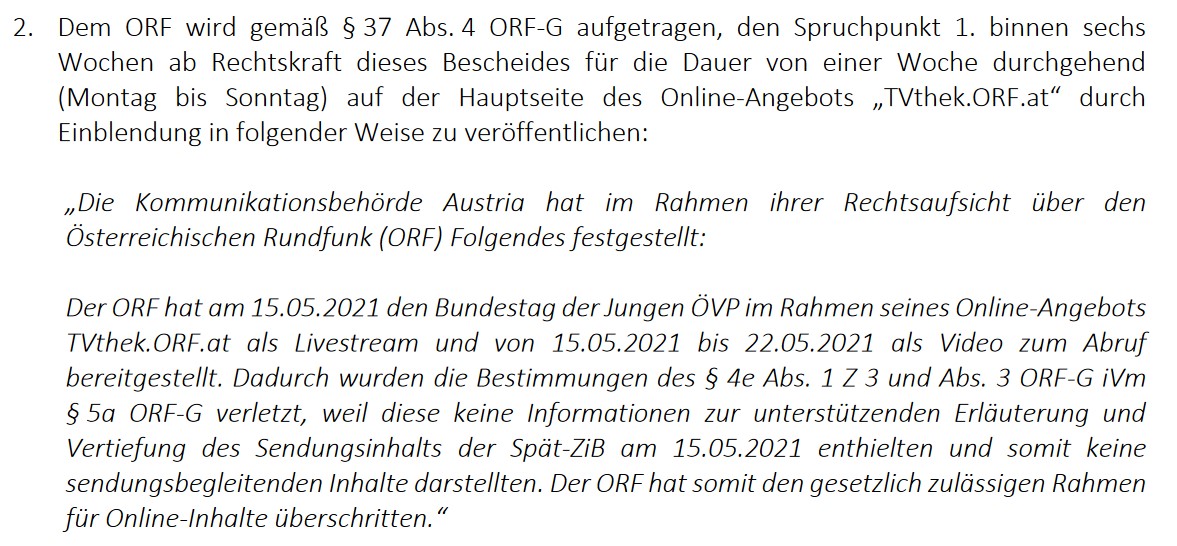 Das ORF-Gesetz legt fest, dass der öffentlich-rechtliche Rundfunk online Berichterstattung liefern darf, die sich “auf die wichtigsten tagesaktuellen Geschehnisse” bezieht. Dazu zählt der Parteitag der ÖVP-Jugendorganisation nicht. Es handelt sich laut RTR auch nicht um einen “sendungsbegleitenden Inhalt” – ein solcher wäre erlaubt.