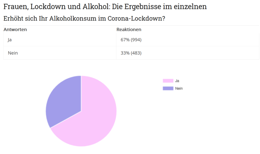 Wien, 29. Dezember 2020 | Fast die Hälfte jener Frauen, die mehr als vor 2020 trinken, geben an, um ein Viertel mehr zu trinken als davor. 40% trinken sogar mehr als doppelt so viel. Besonders besorgniserregend: Ein Drittel befürchtet, dass sich ihr Alkoholkonsum auch nach Corona nicht mehr normalisieren wird.