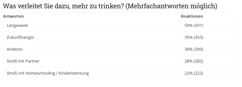 Die Umfrage gilt zwar nicht als repräsentativ, wirkt aber dennoch besorgniserregend. Als Hauptgrund für den erhöhten Alkoholkonsum gilt Langeweile. Dahinter kommen Zukunftsängste und Stress.