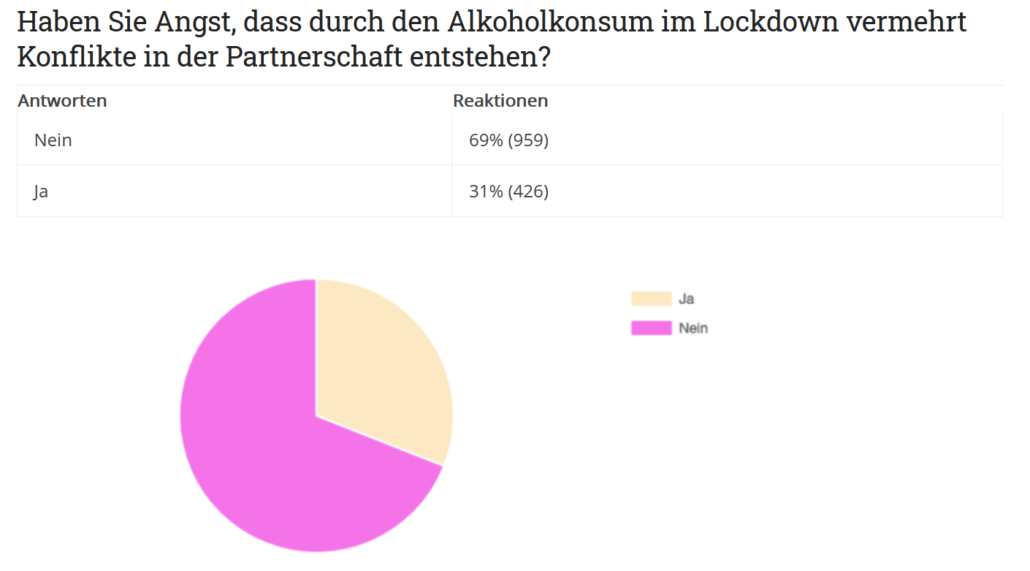 In vier von zehn Fällen trinkt auch der Partner mehr als unter normalen Umständen – ein Drittel der Frauen sorgt sich, dass es durch den vermehrten Alkoholkonsum zu Konflikten in der Partnerschaft kommen könnte. 17% der Befragten haben Angst davor, dass es sie dadurch auch Opfer von Gewalt in der Partnerschaft werden könnten – das geht aus der Umfrage von „Alkohol adé“ hervor.